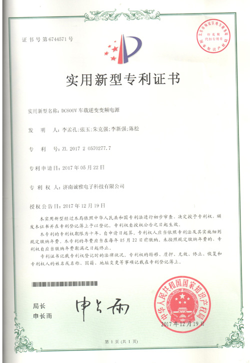 濟南誠雅電子科技有限公司自主研發生產的DC600V車載逆變電源榮獲國家實用新型專利證書